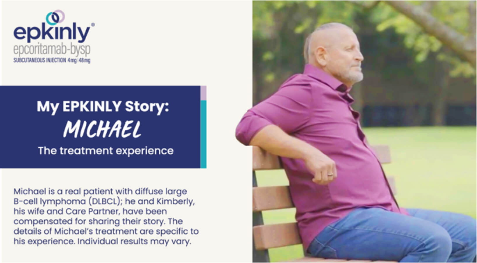VO: EPKINLY is a prescription medicine used to treat adults with certain types of diffuse large B-cell lymphoma (DLBCL) and high-grade B-cell lymphoma that has come back or that did not respond to previous treatment after receiving 2 or more treatments. EPKINLY is approved based on patient response data. A study is ongoing to confirm the clinical benefit of EPKINLY. It is not known if EPKINLY is safe and effective in children.